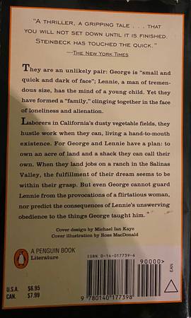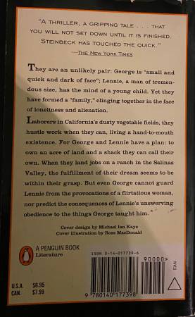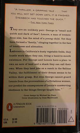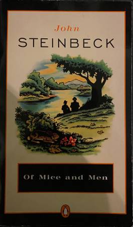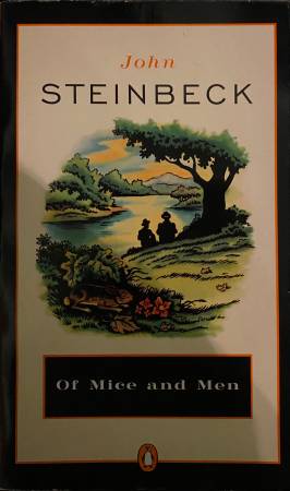 This is a book called Of Mice and Men Book by John Steinbeck. This is a literature book made by Penguin Book. This is a book about people named George and Lennie that are laborers in California. They have a dream to buy an acre of land and to own a shack when they get a job on a ranch in the Salinas Valley. The are working to fulfill their dreams when Lennie meets a flirtatious woman and can not predict the consequences of Lennie's constant obedience to the things George taught him.