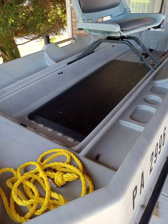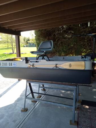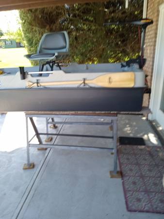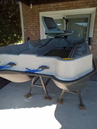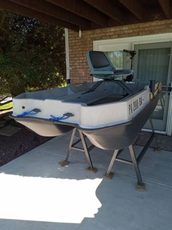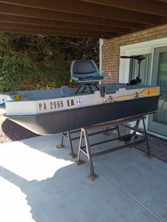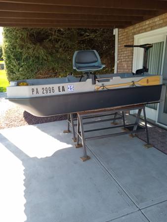Completely set- up with everything you need to get out on the water. 8 1/2 feet long 48 inches wide. Cushioned swivel seat and anti-fatigue padded floor mat keeps sound from traveling. Boat is pre wired in the bow and stern for trolling motor and accessories. Minn Kota Endura C2 30 lb thrust trolling motor with 5 forward speeds and 3 reverse. Minn Kota Power Box with deep cycle battery always stored indoors. Feather Brand wooden oar mounted on side for easy access. Heavy duty custom made stands keep the boat up off the ground and make loading and unloading simple. Stands have carpeted bunks which protects the bottom of the boat and enables one person to easily push the rig on and off the truck or trailer. Rod holders were added on each side of the boat The boat is titled and registered. I live in the Irwin area.
