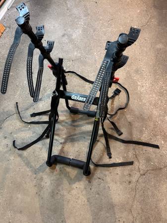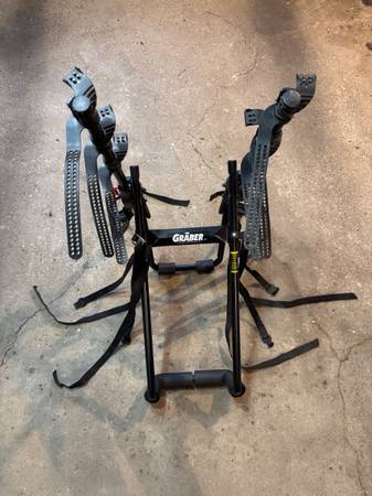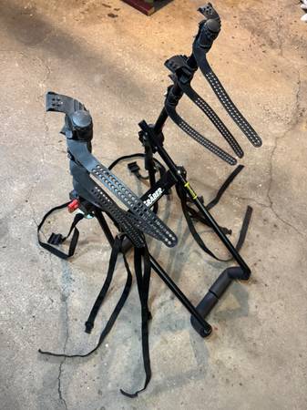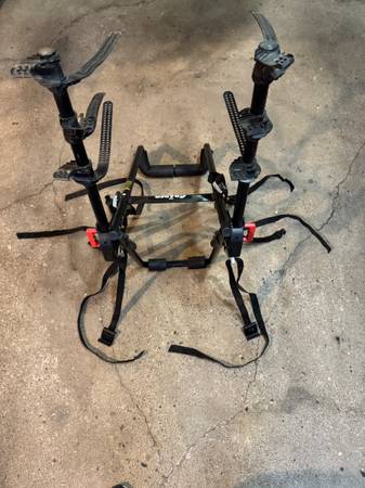 Multi-bike capacity. Straps secure the rack to the vehicle, and cradles hold the bikes in place.