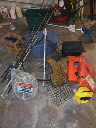 3 life jackets.... one is a fishing vest with 4 pockets. The two orange ones are new/unused -- $20 for all three