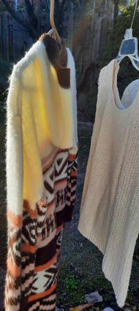 Yellow gold turtleneck size medium, cream sweater size medium, gray pants size 12, black pants size 12, cream sleeveless top size large, long cream/brown/orange sweater size large. Pickups @ my...