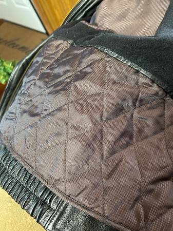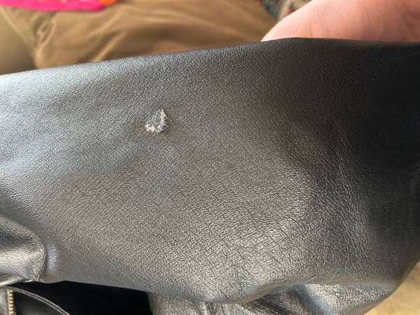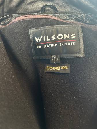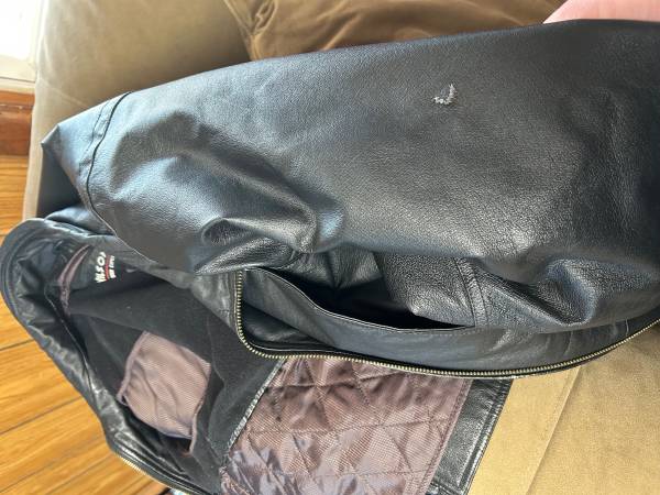 Wilson's Leather Motorcycle Jacket size large in good condition with a slight rip in the leather that I would say is smaller than a penny. Otherwise jacket has lots of life left in it, is durable, lined with thinsulate material, and from a reputable company. Black exterior with brown interior.