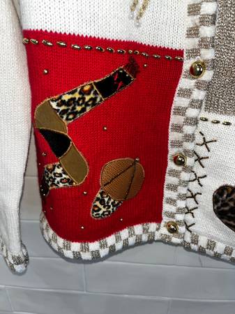 This cardigan sweater has it all: Pom Pom’s / Beaded / Felt / Tiger Print / Gold Checkerboard Outline / Faux Leather/ Winter Theme/ even detail on back / hats / mittens / scarf With original tag...