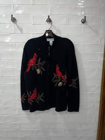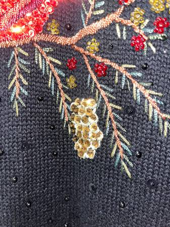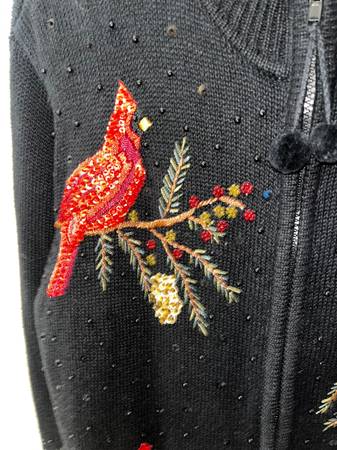 Gorgeous Heirloom Collectibles 2004 Y2K grannycore cardigan sweater: Pom Pom’s / Beaded / Sequins/ embroidery / gold pine cones/ birds / Winter Theme/ front zipper Size Large Armpit to armpit...