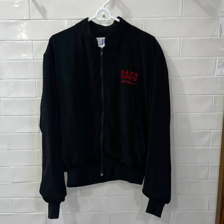 Lined lightweight polyester black bomber zipper front jacket features embroidered accents and a zip closure, two front pockets