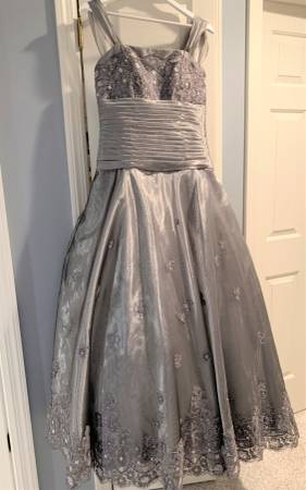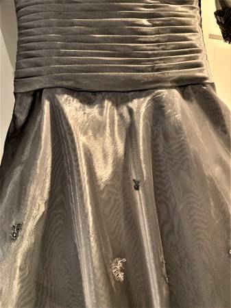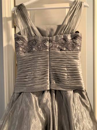 Gorgeous FORMAL Ball Gown Mother of the Bride or Groom Bridal Prom elegant dress - CM COUTURE pewter/silver in color. Designer gown, I paid over $1500 for from Anne Gregory and wore once. Size 8. Very flattering due to lace and ruched middle. 100% polyester. So much detail and beading. Don't miss out on this amazing opportunity to own a beautiful formal dress for such a low price.