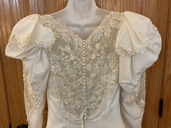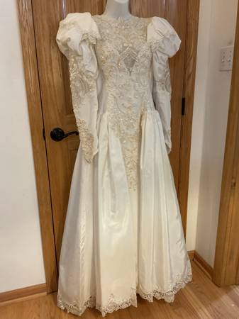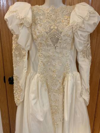 With its unmistakable statement sleeves and bold embellishments, this 1980’s wedding dress is a mix of opulence and modernity. EUC, embellishments are intact and secure, no tears or stains. Unmarked designer. Size 8-10. Measurements: Bust - 32” / Shoulder to Hem - 57” / Sleeve Length - 26” / Waist - 28”. Cleaned and stored responsibly. Reasonable offers welcome. Photos are part of the description. If posted, item is available. Cash only. To purchase, choose a location from the list below and suggest a meeting day/time: