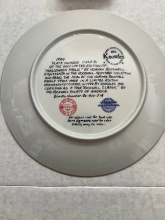 Knowles 8 1/2” collector plate dated 1994. Plate depicts a Norman Rockwell painting called “Halloween Frolic”. It is in the box with all included paperwork and the plate is in like-new condition....
