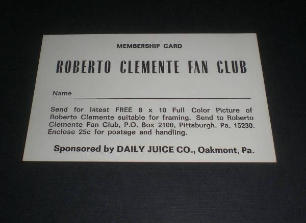 This is a Pirates Roberto Clemente original fan club card sponsored by Daily Juice Company, Oakmont, Pa. Card measures approximately 2 1/2" x 3 3/4". Card can be mailed for $3.50 with paypal payment. Please call show contact info