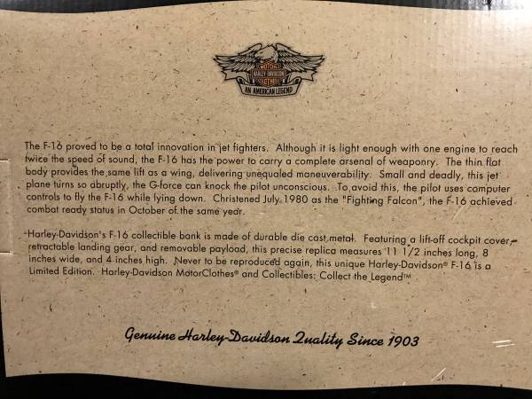 Limited Edition Harley Davidson F16 Die Cast Airplane Collectable Bank. New.