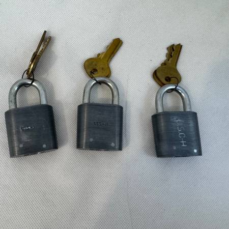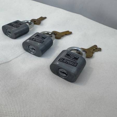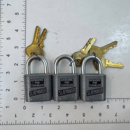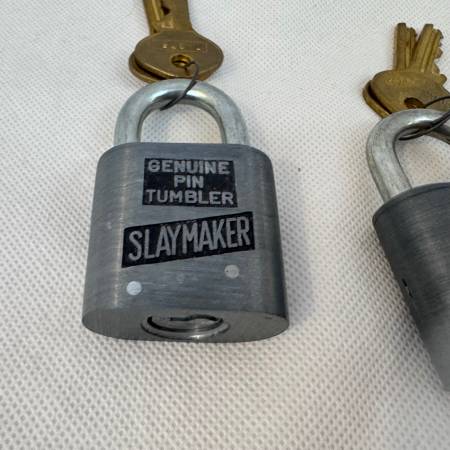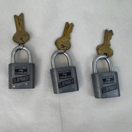 Set of three original Slaymaker padlocks, all marked “Genuine Pin Tumbler.” Classic vintage U.S.-made locks with original brass keys. All three locks come with matching keys and shackle smoothly....