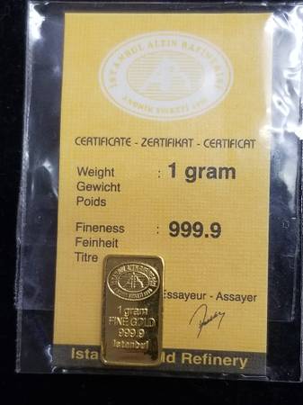 1 gram .999 Fine GOLD BAR. PURE 24 KARAT. Hologram back to protect from counterfeits. Due to an active and everchanging market, Please call for pricing. If interested please call or text 7two4 746...