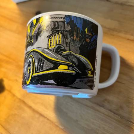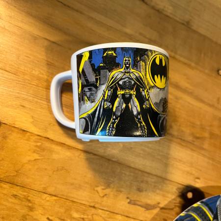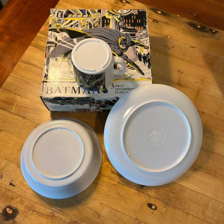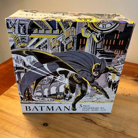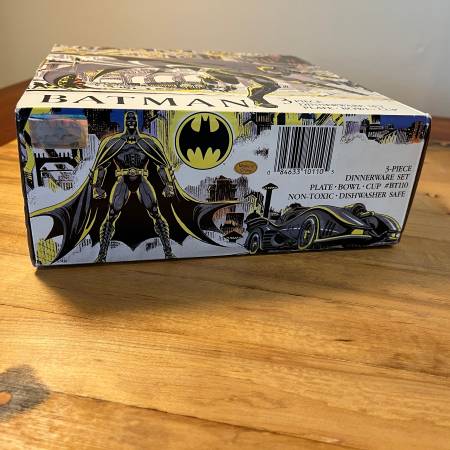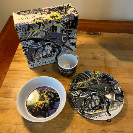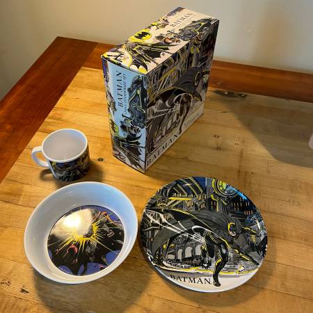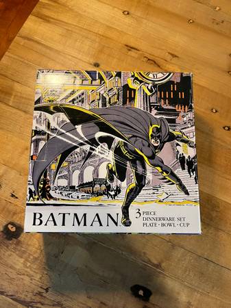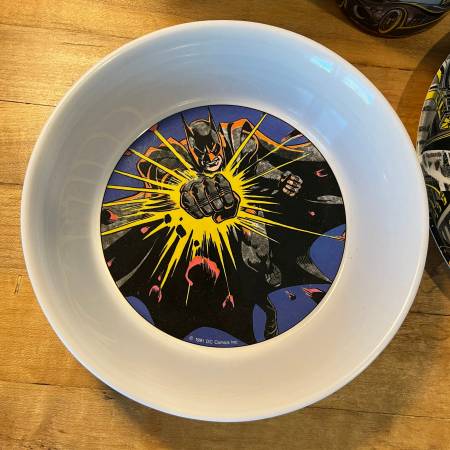 Item: A complete vintage 1991 Batman dinnerware set, including a plate, bowl, and cup.