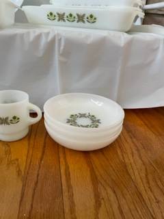 I have a 23 piece set of Fire King in the Green Meadow Flower Pattern. The set includes 2 Round Cake Pans, 2 Piece Round Casserole with Lid, Oval 12" Meat Platter, 8” Square Pan, Rectangle 13 x 8 Casserole Pan, Smaller Rectangle 10 x 6" Pan, A 5-1/2 x 9" Loaf Pan, 4 Soup Bowls with Handle, 4 Ramekin Custard Cups, 3 Coffee Mugs and 3 Salad Bowls. The set is in mint condition. No signs or chips or scratches. Cash Only. Call or text Nonie at show contact info