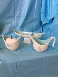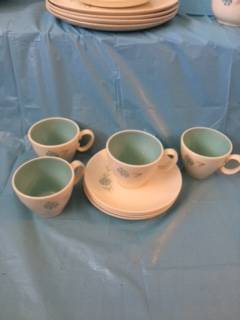 I have a 26 piece of Taylor Smith Taylor Carnation Blue and Pink Flower Boutonniere Ever Yours Dishes. The set includes: 1 Meat Platter, 1 Vegetable Bowl, 4 Berry Bowls, 4 Dinner Plates, 4 Dessert Plates, 4 Coffee Cups, 4 Matching Saucers, 1 Relish Dish, Cream Creamer with Sugar and Lid. Everything is in mint condition. No signs of chips, cracks or scratches. Easy directions from I-79, Rt, 422 or Rt. 68 - call Nonie show contact info