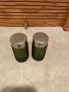 I have a 1960's Anchor Hocking Fire King Soreno Avocado Green Salt and Pepper Shaker Set. The set is textured and made of glass. The set is in mint condition. No signs of chips or cracks. Call or text Nonie at show contact info