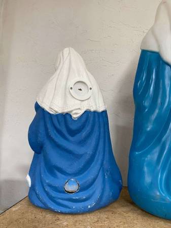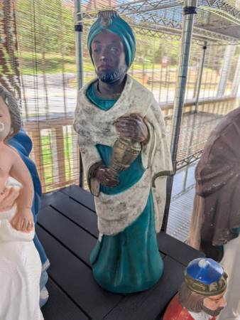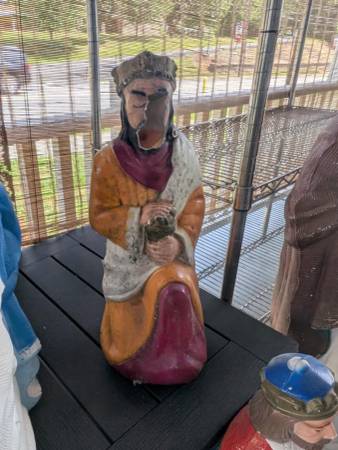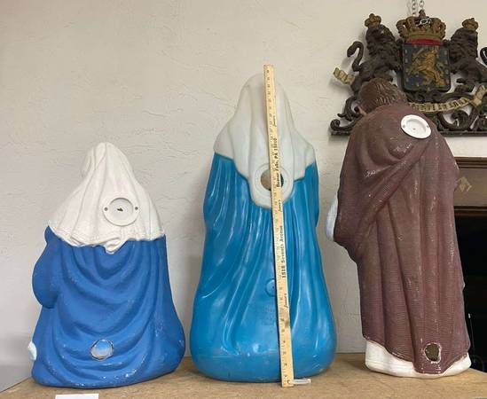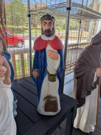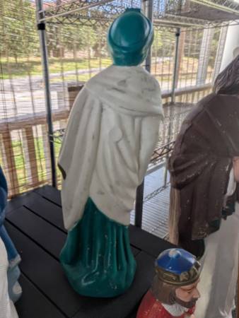 starting at 15 each for regular size wise men, 10 for manger or package deal. the 3 large ones r 35 each or package deal. they come with xmas type cord and light bulb to put in the back to make them light up etc.