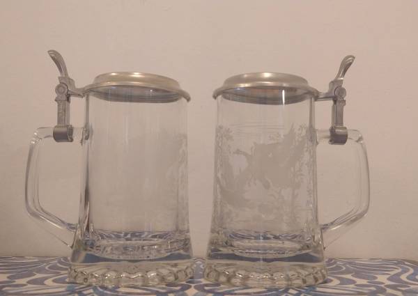 2 VINTAGE GERMAN ALWE ETCHED GLASS BEER STEINS WITH PEWTER LIDS. ELK AND DUCKS 6.5 HEIGHT EXCELLENT CONDITION
