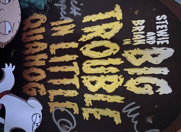 This unique and rare Family Guy poster is a must-have for any fan of the show. The poster features the beloved characters of Stewie and Brian Griffin, and is signed by Alex Borstein, Mike Henry, and other members of the crew.