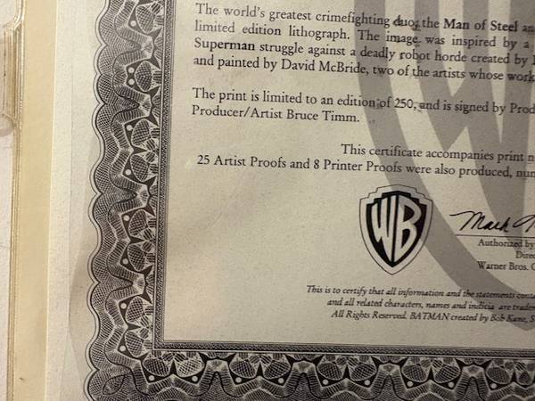 I have for sale from the Warner Bros Studio Store The New Batman and Superman Adventures "Champions of Justice" Limited Edition Lithograph. This is a fantastic pice of art based off of the 1997 Batman Superman-World's Finest animation film.. This Collectible piece of art was released in 1997 and was for sale in the Warner Bros Studio Stores.