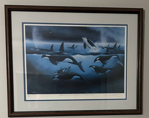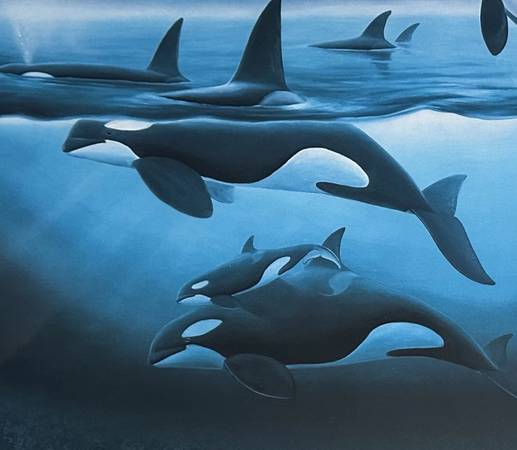 This Wyland hand-signed limited edition lithograph features the majestic killer whales, orcas, in their natural ocean habitat. The artwork captures the beauty and power of these magnificent creatures that roam free in the sea.