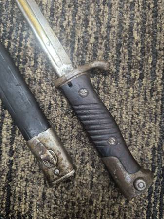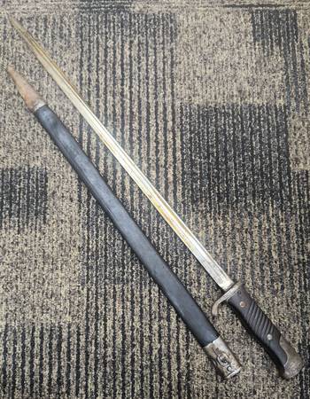 Genuine bayonet from World War I German artillery. Manufactured by Simson & Co. Suhl. Excellent condition and still has some cosmoline on the blade. Measures 26-1/2 inches long in the sheath, dagger is 25-5/8", blade is 20-1/2 inch. Wood handle.