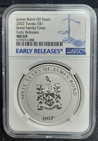 JAMES BOND 007 60 Years 2022 Tuvalu SILVER $1 COIN Bond Family Crest Early Release NGC MS69 If interested call or text 7two4-746-9190 no emails.