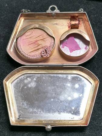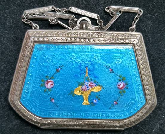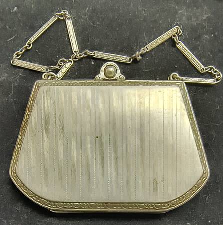 Right out of the roaring twenties comes this beautiful hand enameled decorated clutch purse / makeup bag. The quality is exceptional as is the detail. Absolutely no chips to the enamel whatsoever. Inside there is a mirror a slot to hold rouge a powder puff / powder spot and a clip to hold a small eyeliner pencil. The peace is signed Marathon. Measures 3 and 1/4 inches by 2 and 1/2 inches high and the chain is approximately 5 inches long. Composed of solid nickel silver. Superior quality from a bygone era! If interested call or text 7two4-746-9190 no emails.