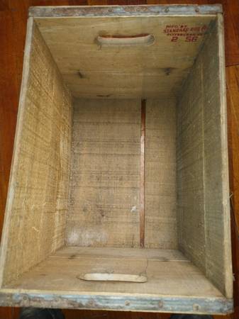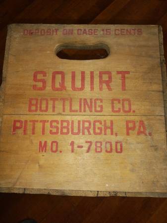 Vintage squirt bottling company wooden crate from PGH Pa. Has a metal band around outside corners. Has 15 cent deposit on it. Not sure if it's a date on inside says 2/56. 17 inches across 12 inches...