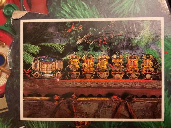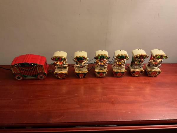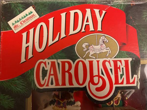 Mr. Christmas 1992 Holiday Carousel Mechanical Collectable. Enchanting display of lights and music. 6 Carousel Horses follow a Circus Organ that plays 21 different carols. May be plugged in and displayed on a mantel, table or hung on the tree. On/Off switch and volume control. Set is complete and fully operational. All original (no replacement parts or repairs). No fading or discoloring. Clean. Like New condition. Original box and paperwork included. If posted, item is available. Cash only. From nonsmoking, pet free residence. Photos are part of the description. To purchase, choose a location from the list below and suggest a meeting day/time:
