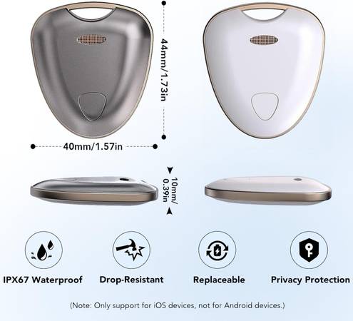 【Economical & Portable & Durable Design】Compact in size, doesn't take up much space, and is easy to carry. It is a no monthly fee app locator. This small tracking device boasts an IP67 waterproof rating and a replaceable battery that lasts a year, withstanding water exposure and eliminating frequent battery changes. Its rugged zinc alloy shell ensures drop resistance, enduring falls of up to 5 meters without damage.