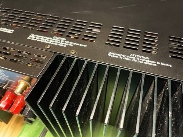 Design: Triple Darlington output stage, heavy transformer, large heatsinks, thermal/high-current protection.