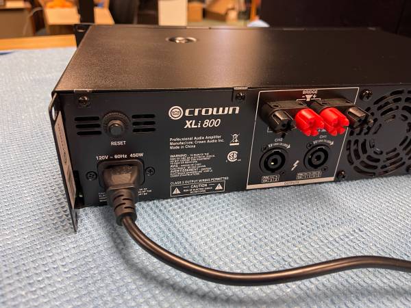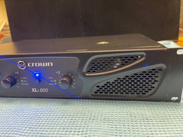 Crown XLi-800 professional amplifier. This unit is powerful, reliable, and affordable. The XLI series from Crown are suited for musicians, DJs and entertainers, as well as houses of worship discos or pubs. This unit is also an excellent choice for home audio. It is 300 watts into four ohms or 200 watts into eight ohms.