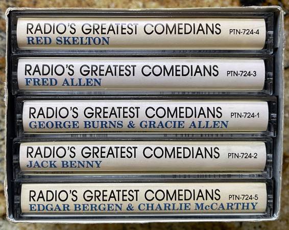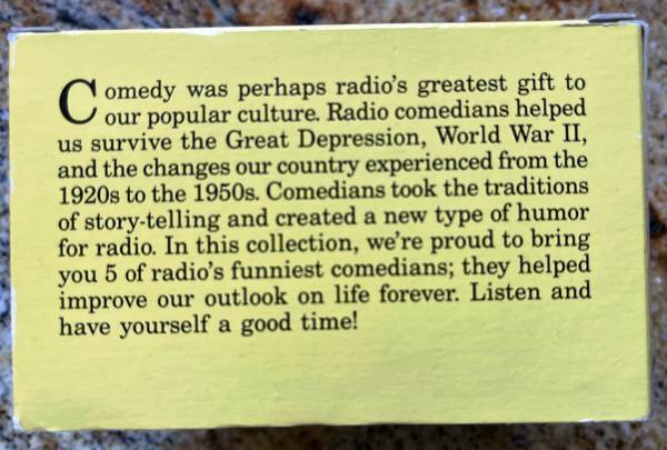 The product is a box set of 5 cassette tapes titled "Radio's Greatest Comedians" featuring the artists Allen, Benny, Burns, Bergen, and Red Skelton. Released in 1992 by Prime Time Nostalgia, this collection offers classic comedy and spoken word in English. Each cassette comes in a yellow jewel case and is in good condition. Perfect for fans of vintage comedy and radio shows, this nostalgic set is a must-have for those who appreciate the humor of the past.