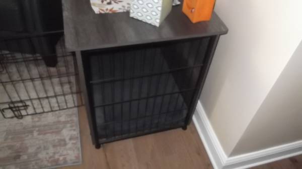End table furniture style dog crate: Medium size See pics Approximate size: 31 1/2 x 21 3/4 x 25 3/4 High Inside: 30 x 19 x 20 1/2 High Grayish in color with black streaking. For medium sized dog....