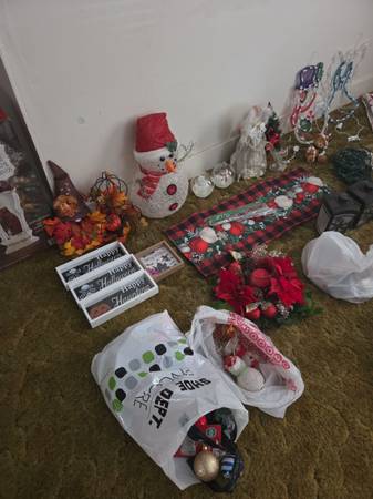 Assortment of items. Christmas projections lights-some new,some used. Christmas shower curtain w/hooks, new bulbs,etc. There is a tote with some Christmas inflatables that will go with all this. Don't know if they work or not. This is a package deal, first $80 takes it.