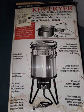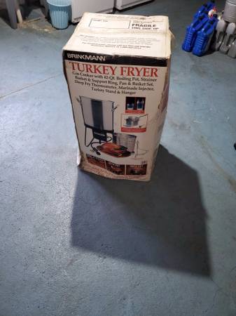 Brand new in unopened box. Never used. Turkey fryer, 42 qt., strainer basket, pan and basket, 10 in deep fry thermometer, marinade injector, turkey stand and hanger, large burner, regulator and...