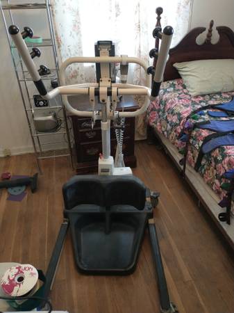 Battery operated sit to stand lift. 350 lb. capacity. Pendant controlled smooth lifting and lowering. Very helpful for a care giver to lift and move patient to shower, toilet, bed, wheel chair, living area. Buyer may inspect and test prior to acceptance. Delivery available.