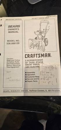 Craftsman 5 horsepower 22" dual stage snow blower with 120v electric start model 536.886120 with owner's manual