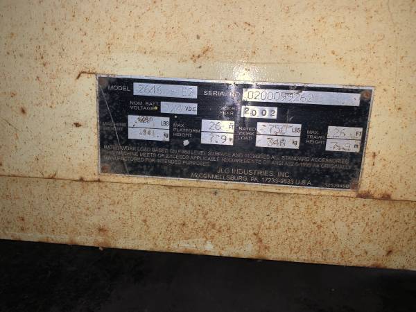 This scissor lift is model 2646-E2. The machine weight is 280 pounds. The maximum height is 26’ 7.9” and the weight lot is 750 pounds. Very low hours and new batteries. Works great. Any questions...
