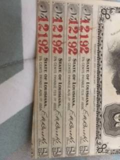 By the end of the Civil War, the federal government imposed a hefty tax on state bank notes. The state of Louisiana was able to cleverly avoid paying the tax by issuing bank notes disguised as bonds with interest-bearing coupons, like these $5 "Baby Bonds" - nicknamed because of the picture of the baby engraved on the face. The public knew they were worth the same as federally approved currency, so they were used throughout Louisiana like regular bank notes. This genuine $5 Baby Bond bears its own unique serial number and the facsimile signature of Louisiana's state treasurer, Ed Bunker.