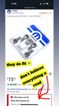 used good condition off an alfa romeo 4c i don’t personally want wheel lock lug nuts so i switched back to stock but if u do $35 obo