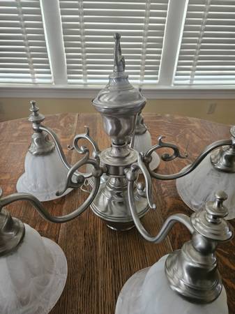 Silver light fixture. Its in great condition and has 6 lights. Looks great in kitchen or dinning room. Message for questions. Thank you