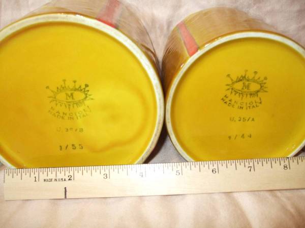 Mancioli Italian Porcelain Round Gift Box Canisters in Yellow Circa 1972 Measured Size and Markings: 6.75" diameter 6" deep U.35/D 1/44 6" diameter 5.25" deep U.35/C 1/44 5.25" diameter 4.75" deep...