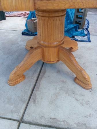 58" round table, pictures 1,2,3, one piece top with no leaf. Top is a little rough but a very solid table. $50