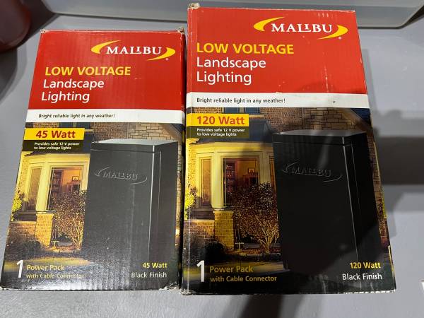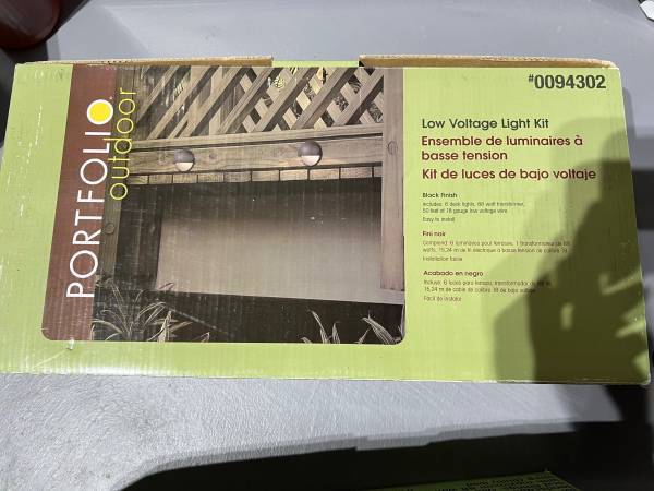 Portfolio Outdoor low voltage deck lights, set of 6. Black finish. Have two. Malibu low voltage power pack, black finish, 120 watt and 45 watt. Includes wire cable for hardwiring. Everything is...