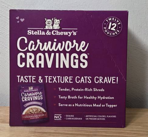 Location: SWISSVALE, PA 15218 23 Pouches Stella & Chewy's Chicken & Tuna Carnivore Cravings Savory Shreds Wet Cat Food • (23) Chicken & Tuna Expiration: 2/27 Location: SWISSVALE, PA 15218
