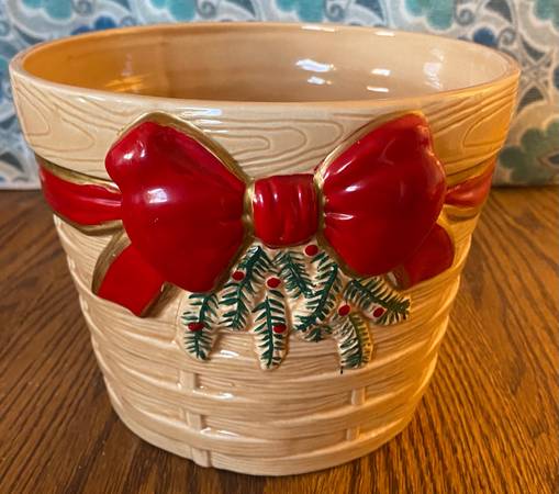 This is a beige and red and green pot with a red bow, pine, and six red berries on it for plants for Christmas like Poinsettias or other Christmas plants. This could also hold other Christmas items around the house.