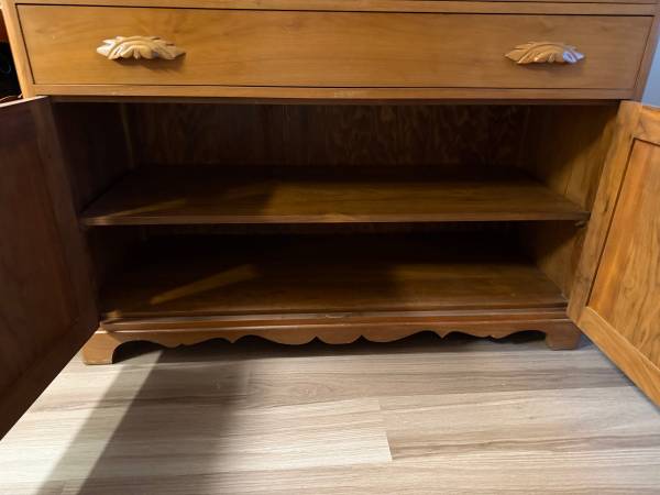 Dimensions of the bottom cabinet are 38” tall, 52” wide, 22” deep. Smaller drawers are 18.5 x 22 x 4”. Larger drawer is 18,5 x 46 x 5.5”. Bottom cabinet section is roughly 20” tall with a shelf that’s 46” wide near the middle.