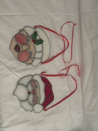 Mr. and Mrs. Santa Clause window sun catchers. Like new. Both have gold wire frame glasses on also with red ribbon string to hand in windows. Both for $10.00.
